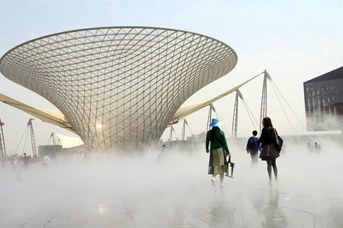 雾化喷头,如EAE的红宝石喷头,是通过高压力而进行的冷却蒸发式喷头。它形成的水珠直径仅为10微米,因此它可以很快地蒸发,高温时节快速蒸发的水珠可以使周围环境在几秒钟内下降3-7℃左右。同时喷头可以在周围形成一层轻纱状的云雾,防止空气中的灰尘及其他杂物。因此雾化喷头可以同时作为保湿、降尘以及夏日消暑的多功能产品。人工造雾设备可以为建筑以及园林景观添姿增色,现已成为建筑设计与景观设计中的宠儿。