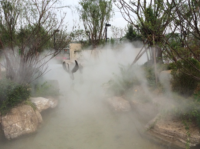景观造雾所要求雾的颗粒比较小,以5—10微米为宜,负离子是人造雾和冷雾都可以产生的。它的化学反应式是H2O—H++OH-,即水—轻离子+氢氧根离子,水是一种极弱的电解质,它能微弱的电离,水电离后即变化成氢氧根离子即负离子,雾化喷头是通过高压力而进行的冷却蒸发式喷头。它形成的水珠直径仅为10微米,因此它可以很快地蒸发,高温时节快速蒸发的水珠可以使周围环境在几秒钟内下降3-7℃左右,同时喷头,可以在周围形成一层轻纱状的云雾,防止空气中的灰尘及其他杂物,因此雾化喷头可以同时作为保湿、降尘以及夏日消暑的多功能产品,由于喷雾形成特殊的云雾效果,可以为建筑以及景观景观添姿增色,现已成为建筑设计与景观设计中的宠儿,例如上海世博会的气象馆“云中水滴”就是一个很好的例子。